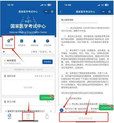 第一步:登陆成功之后可点击“开始报名”或者直接点击下方菜单中的“服务”,阅读报名须知并勾选后方可进行下一步报名。