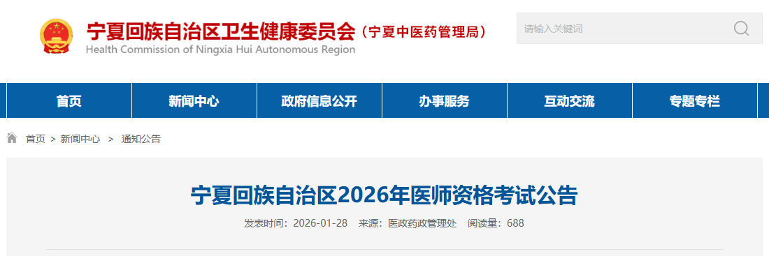 宁夏回族自治区卫生健康委员会发布关于宁夏回族自治区2026年医师资格考试有关事项公告,通知详情如下: