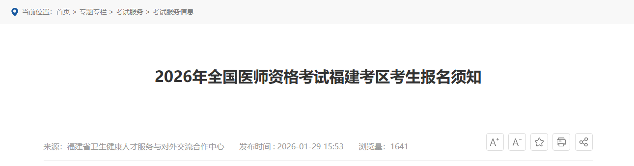 福建省卫生健康委员会发布关于2026年全国医师资格考试福建考区考生报名须知,网上报名时间为1月29日10时至2月11日24时,现场审核时间为2月27日至3月12日,通知详情如下: