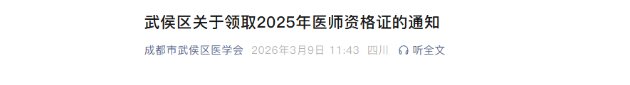 成都市武侯区关于领取2025年医师资格证的通知