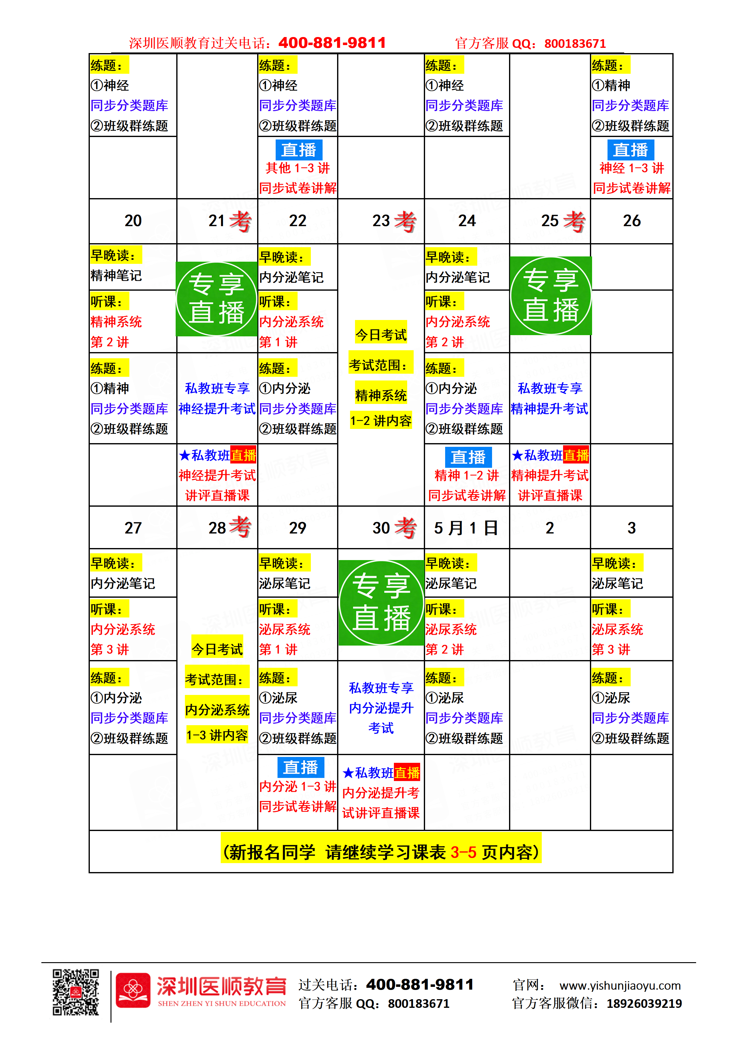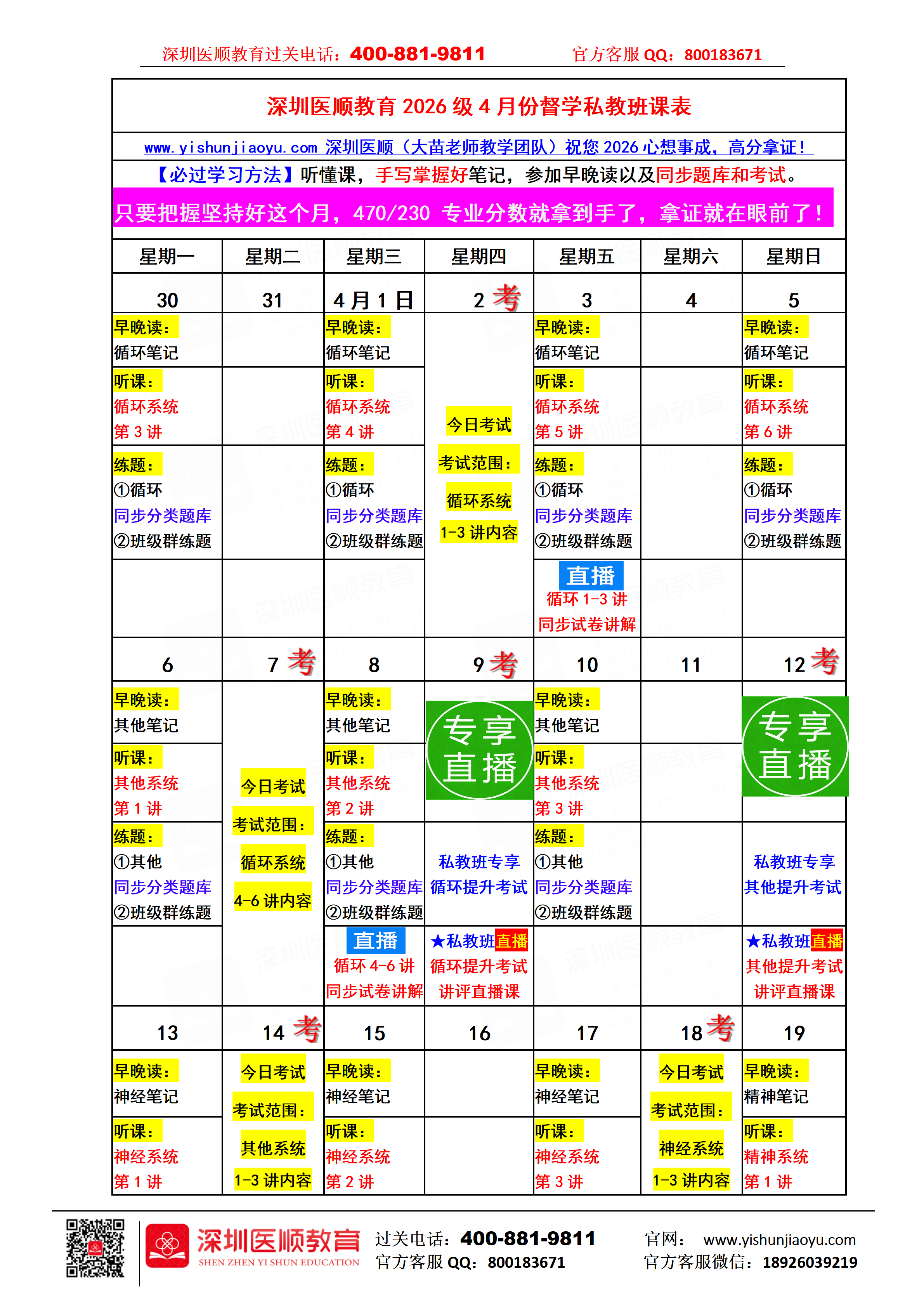 深圳医顺教育2026级4月份督学私教班课表