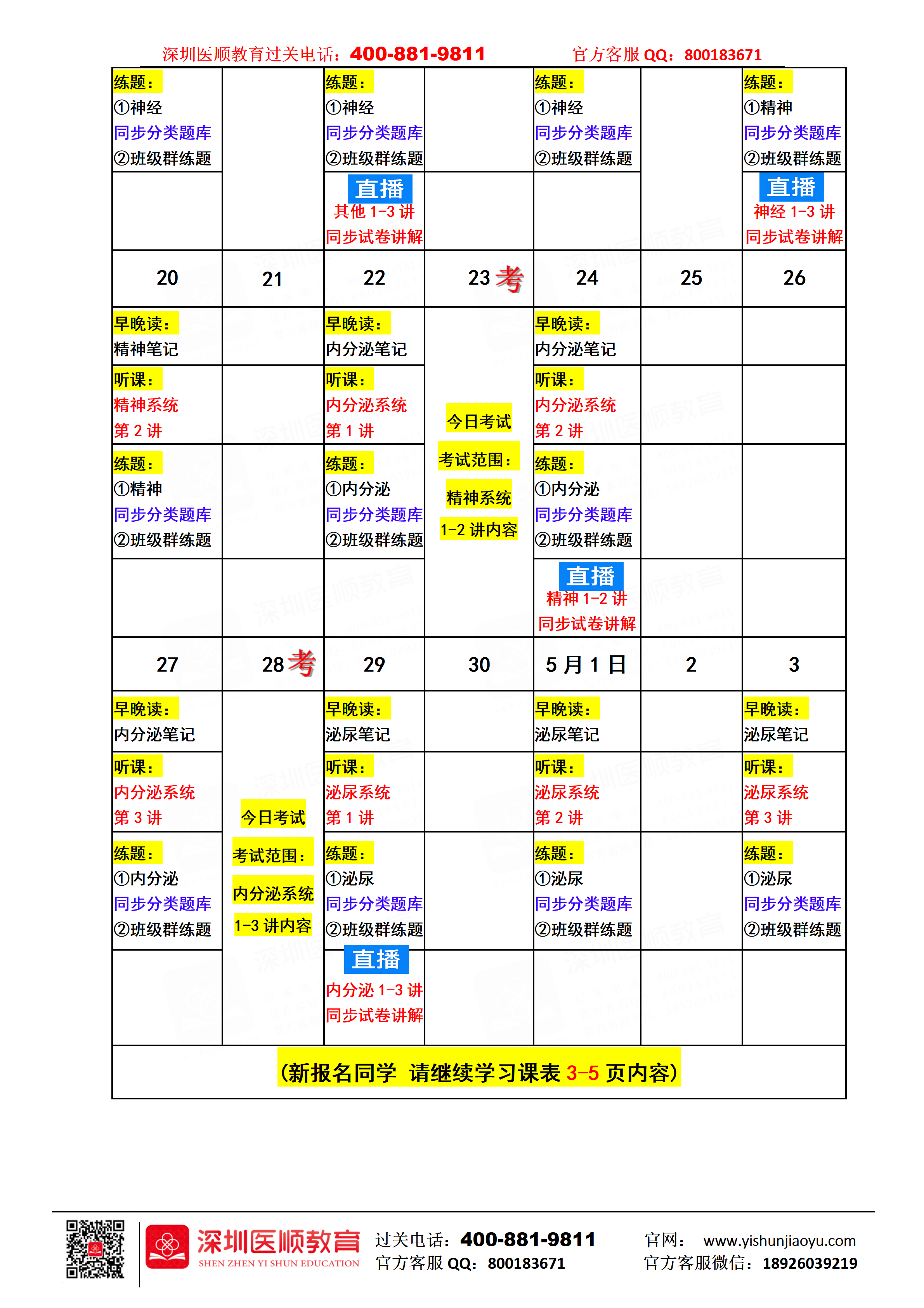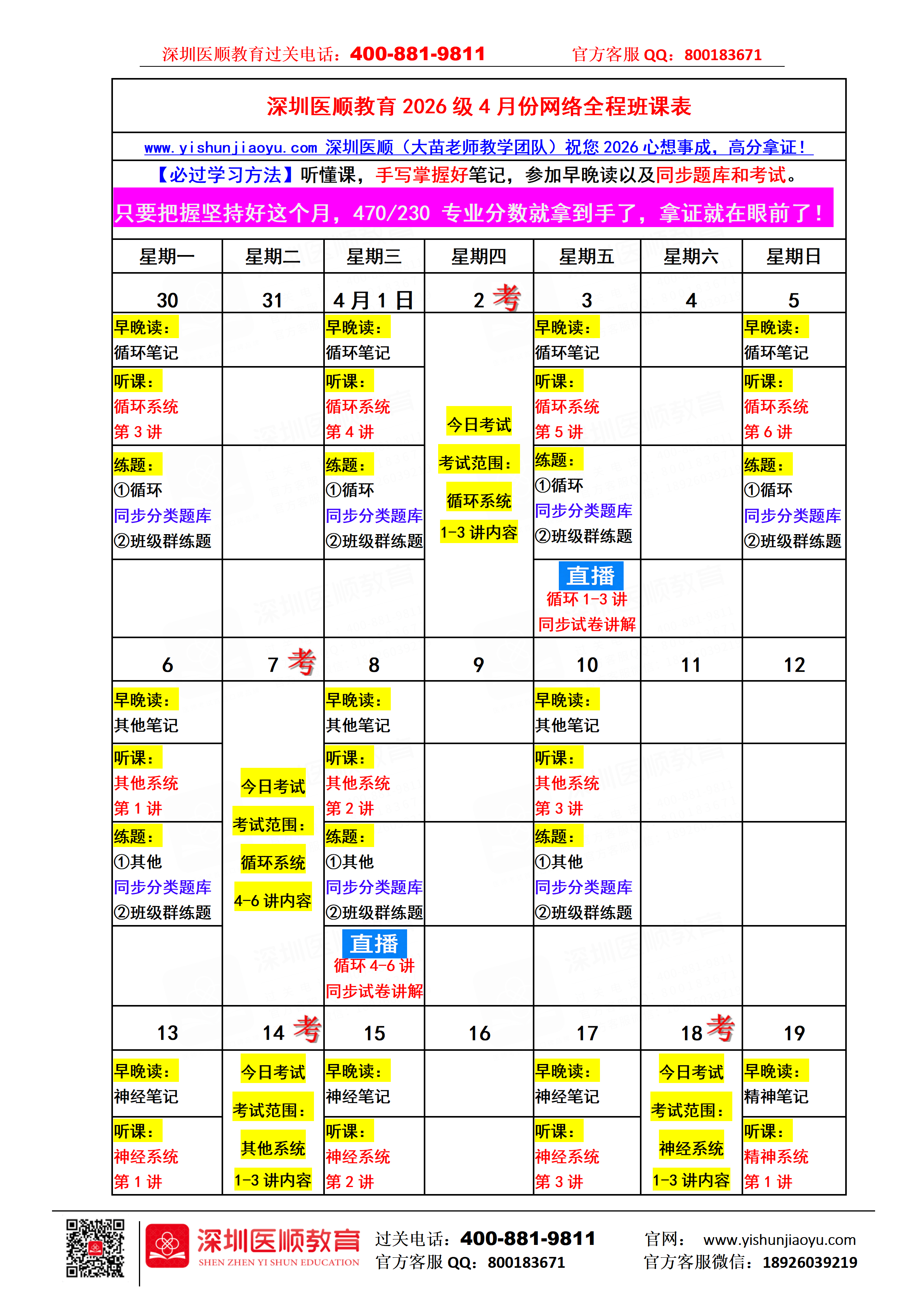深圳医顺教育2026级4月份网络全程班课表