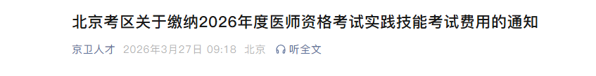 北京卫生健康委员会发布北京考区关于缴纳2026年度医师资格考试实践技能考试费用的通知,缴费时间3月27日10时—4月7日24时。通知详情如下:
