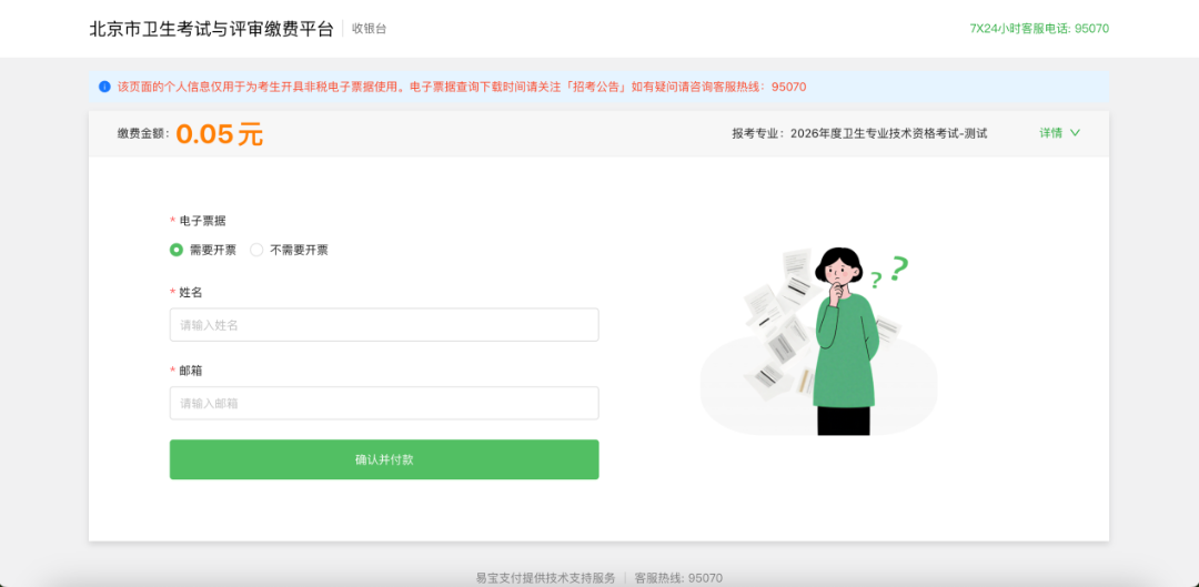 (八)查票时忘记缴费时输入的邮箱号,或缴费前选择不开票又需补开票据请联系易宝支付技术支持热线:95070,提供缴费订单支付截图,由易宝客服人员来协助提供电子票据。
